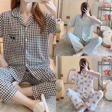 소라해 여성용 파스텔 무지 체크 반팔긴바지 잠옷