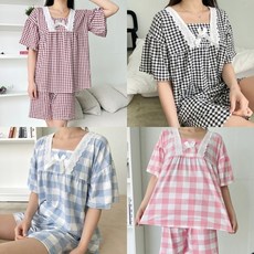 여성 체크 반팔 상하의 파자마 홈웨어 잠옷 세트